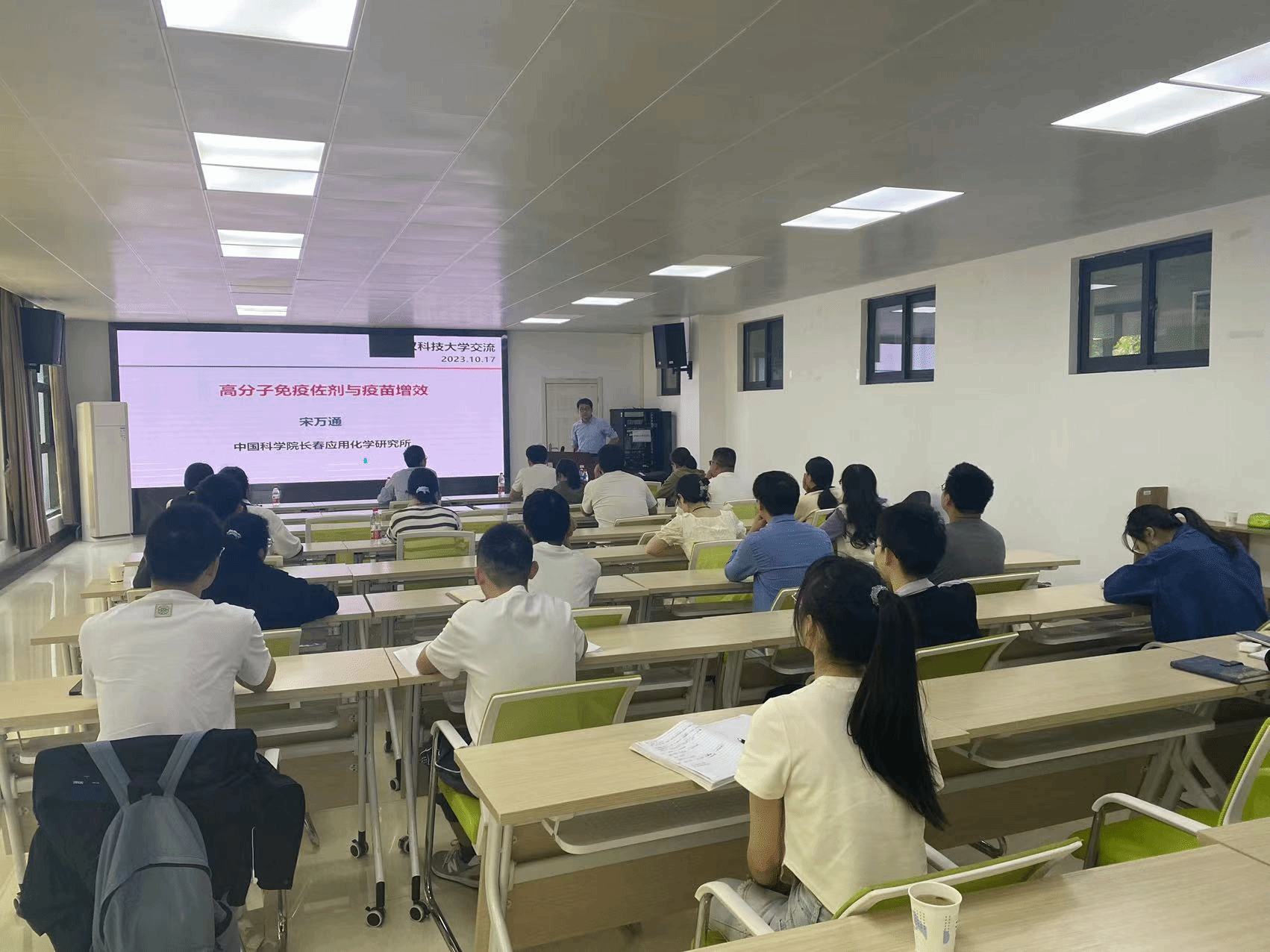 长春应用化学研究所宋万通研究员和西安交通大学成一龙教授受邀来校开展学术讲座,讲座题目分别为“高分子免疫佐剂与疫苗增效”和“组织修复高分子水凝胶”。生科院廖兴华副院长、李钰策老师、邱文秀副教授、徐承晨老师、郑鹏老师、徐尧老师等教师以及博/硕士研究生、本科生参加了本次讲座。
