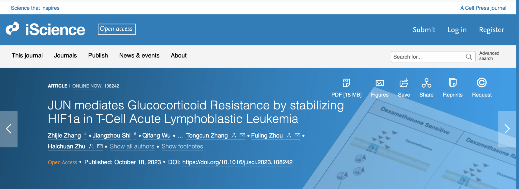武科大网讯 10月18日,我校91在线 祝海川、张同存课题组联合武汉大学中南医院血液科周芙玲教授课题组合作在Cell综合性子刊iScience上发表题为“JUN mediates Glucocorticoid Resistance by stabilizing HIF1A in T-Cell Acute Lymphoblastic Leukemia”的研究性论文。