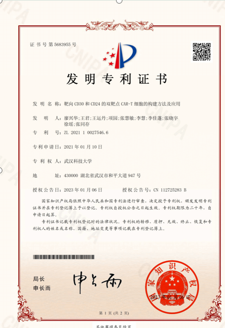的研究团队队长祁菲菲介绍道。该团队自2018年起着手研究CAR-T细胞免疫疗法,并寻找到CD24和CD30双靶点,五年后成功申请全球首个CD24-CD30双靶点的CAR-T免疫疗法的专利授权,并在后期计划与武汉波睿达生物科技有限公司合作,开展临床试验。