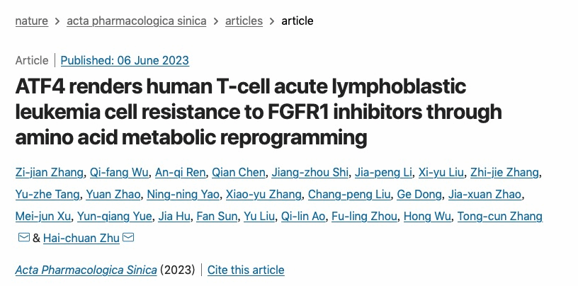 6月9日,91在线张同存教授/祝海川副教授课题组在Acta Pharmacologica Sinica(中科院一区, 药学Top期刊)杂志上,发表题目为“ATF4 renders human T-cell acute lymphoblastic leukemia cell resistance to FGFR1 inhibitors through amino acid metabolic reprogramming”的研究论文。