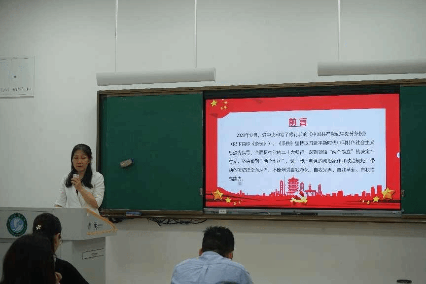 党委书记王婧给毕业生党员讲授《学习解读<中国共产党纪律处分条例>》的专题党课。她结合《中国共产党纪律处分条例》修订的背景和过程,着重向在座学子强调了《中国共产党纪律处分条例》修订的重要意义,介绍了条例修订的主要内容,分享党史中的纪律故事。引导全体毕业生党员坚持不懈用习近平新时代中国特色社会主义思想武装头脑,自觉增强“四个意识”、坚定“四个自信”、做到“两个维护”、捍卫“两个确立”,强化党性意识和组织观念。